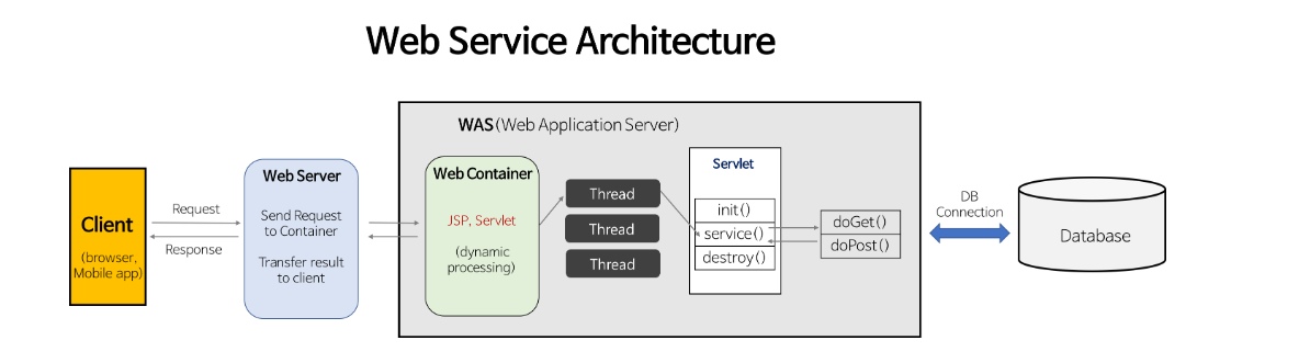 - (3) WAS는 web.xml을 참조해 해당 Servlet에 대한 스레드를 생성(스레드 풀 이용)