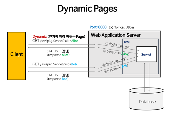 인자의 내용에 맞게 동적인 contents를 반환한다. 웹 서버에 의해 실행되는 프로그램을 통해 만들어진 결과물이다